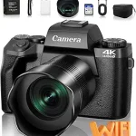 Saneen Digital Camera for Photography, 4K 64MP WiFi Touch Screen Vlogging Camera with Flash, 32GB Micro Card, Lens Hood, 3000mAH Battery, Front and Rear Cameras, 4″Big Screen, Hot Shoe Interface-Black